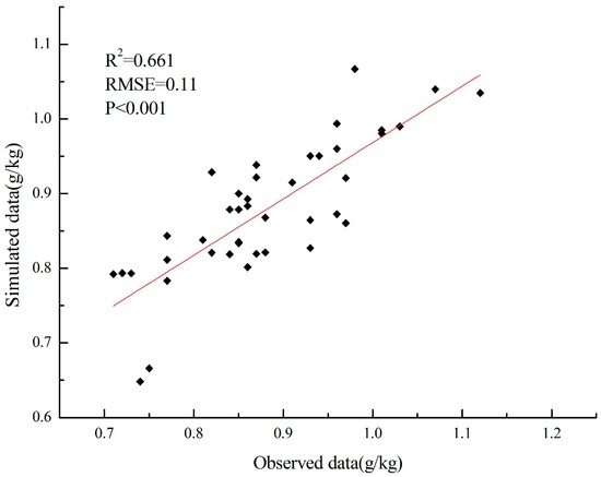 Through the random method, we got 41 sampling points, obtained their geography coordinates, and overlaid the coordinates of sampling points on the simulation images to get the simulated results. In Table 4, the simulated mean value of total phosphorus (TP) is 0.878 g/kg, and the observed mean value is 0.881 g/kg. Other statistical standards, which include the maximum values, standard deviations, and standard error of mean, were also used to show the distribution characteristics between the two data groups. We obtained observed and simulated values and used the data to represent the conditions of this area. In Figure 5, the test results show that R2 of the observed and the simulated data is 0.661, demonstrating that the P model is reliable.