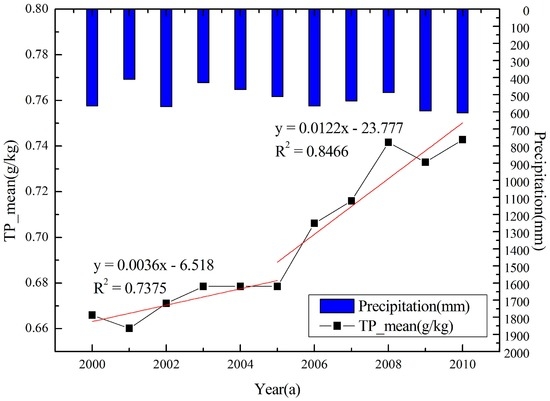 In detecting abrupt changes with a non-parameter Mann-Kendall test method, the results showed that the yearly total phosphorus load abruptly changed in 2005. The study period was divided into two intervals: 2000–2005, and 2006–2010. Figure 6 shows that the total phosphorus load in the Sanjiang Plain has a trend of overall increase. The P-load presents a relatively low growth rate during 2000–2005 (0.0036 g/(kg·a)), then increased during 2006–2010 (0.0122 g/(kg·a)). During 2006–2010, the growth rate of the total phosphorus load presented a trend of rapid growth for the Sanjiang Plain. This is because much wetland (~1800 km2), pasture (~1500 km2), and woodland (~1200 km2) were converted to paddy field (~3500 km2) and dry land (~1000 km2), resulting in a rise in the amount of fertilizer application, and thus total phosphorus. The p value was 0.1569, which is larger than 0.01. The overall correlation between NPS mean total phosphorus and precipitation was not significant.