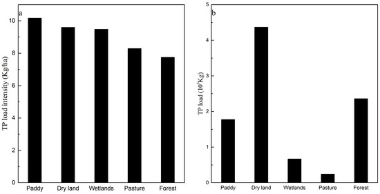 A statistical test (one-way ANOVA) was applied to evaluate the significance of differences in TP load intensity among different land use types. The P value was 0.0012, showing that there was significant difference in TP load intensity among different land use types (p < 0.05). The total phosphorus load intensity is heterogeneous in different land use types. The average value of the total phosphorus load intensity in different land use types can be ranked in descending order as paddy field, dry land, wetlands, grassland, and forestland (Figure 7a).