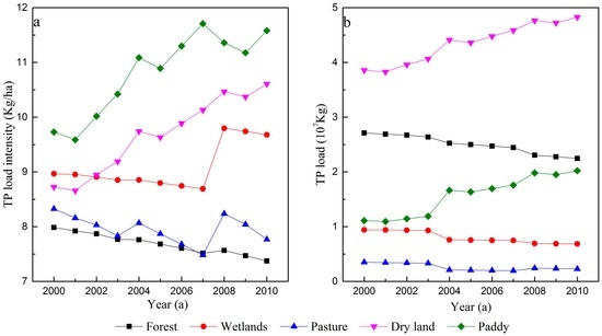 Load intensity (a); and load (b) of total phosphorus (TP) for each land use between 2000 and 2010.