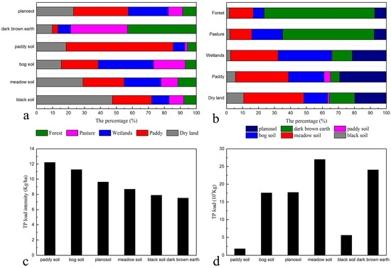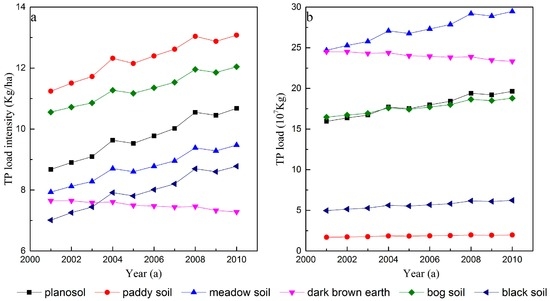 The one-way ANOVA test was applied to evaluate the significance of differences in TP load intensity among different soil types. The p value was 0.00005, showing that there was significant difference in TP load intensity among different soil types (p < 0.05). The total phosphorus load intensity is heterogeneous among different soil types. The average value of the total phosphorus load intensity in the main soil types can be ranked in descending order as paddy soil, bog soil, planosol, meadow soil, black soil, and dark brown earth between 2001 and 2010 (Figure 9c,d).