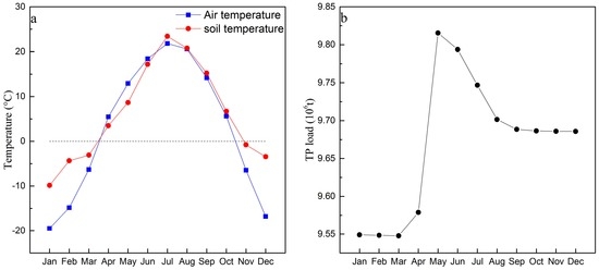 Monthly air and soil temperatures (a); and total phosphorus (TP) load (b).