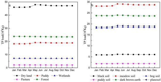 Monthly total phosphorus (TP) load from each: land use type (a); and soil type (b).