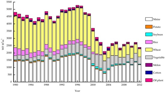 Nine main types of crops were chosen based on their acreages in Beijing. Figure 1 shows the results of the calculation of the agricultural WF within Beijing from 1980 to 2012. Over the past 33 years, the agricultural WF within Beijing decreased from 4802.30 million m3·year−1 to 2388.45 million m3·year−1 (Figure 1). However, the WF experienced varying trends during 1980–2012. During 1980–1990, the WF slowly decreased. Then, it had a significant upward trend and reached its peak during 1991–1996. From 1997, it quickly declined, and the WF in 2003 had the lowest value of 2110.55 million m3·year−1. This year also marked a change in the inflection point. Since 2004, the WF tended to remain stable. In the terms of the individual components of the agricultural WF within Beijing, wheat, maize, and vegetables accounted for the largest proportion. Among three types of WF, the blue WF was larger than the other two WF (Figure 2). During the study period, the blue WF was the largest part of the total WF, with a proportion of 50.43%, followed by the grey and green WF, which accounted for 29.55% and 20.02%, respectively. Nevertheless, the blue WF has rapidly declined over the past three decades. This is mainly due to the adjustment of the plantation structure in Beijing. For example, rain-fed maize has largely replaced wheat [17], which has had a significant effect.