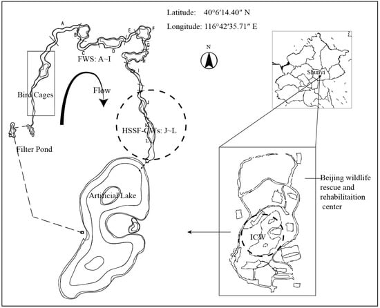 Our study was carried out in a HSSF-CW in the Beijing Wildlife Rescue and Rehabilitation Center, Beijing, China (Latitude: 40°6′14.40′′ N, Longitude: 116°42′35.71′′ E) (Figure 1). The annual average temperature at the study site is 11.5 °C. The average temperatures in January and July are 4.9 and 25.7 °C, respectively, and the minimum temperature in July 2012 and 2013 was 19.1 °C. The average annual rainfall is 625 mm from 2012 to 2013. The wetland consists of three treatment cells (Table 1), and its purpose is to improve the water quality of the artificial lake in the site. The main pollution source of the water is the waste water from the bird life in the lake. Gravel is the principal media; there are two layers, one 20 cm deep that comprises gravels with a diameter of between 15 and 30 mm and the other 50 cm deep comprised of finer gravels with diameters of between 5 and 15 mm from bottom to top. The average water depths in the three treatment cells are 0.3, 0.1, and 0.1 m. Plants in the upper media, planted at a density of two plants per square metre, show vigorous growth. The plant species are mainly Lythrum salicaria, Iris tectorum, and Scirpus validus, with densities of 30, 50, and 60 stem/m2, respectively. Birds, such as Ardea alba, Anas platyrhynchos, and Anatidae, are frequently observed at the lake.