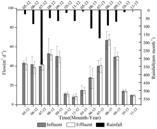Water injection to the HSSF-CW began in April. As time progressed, the inflow gradually increased. Drainage began in October and the flow decreased with drainage, so the annual flow showed an initial increase and then decreased (Figure 2). The maximum rainfall in the experimental period occurred in July 2012, when 337 mm was recorded; the minimum rainfall (0.5 mm) occurred in November 2013. The outflow was higher than the inflow in July because of the more intensive rainfall in this month.