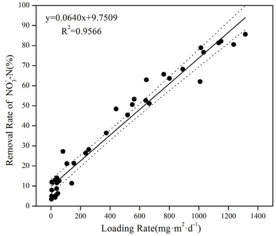 Relationship between the areal loading and removal efficiency for NO3−-N (the dotted line indicates the 99% confidence limit).