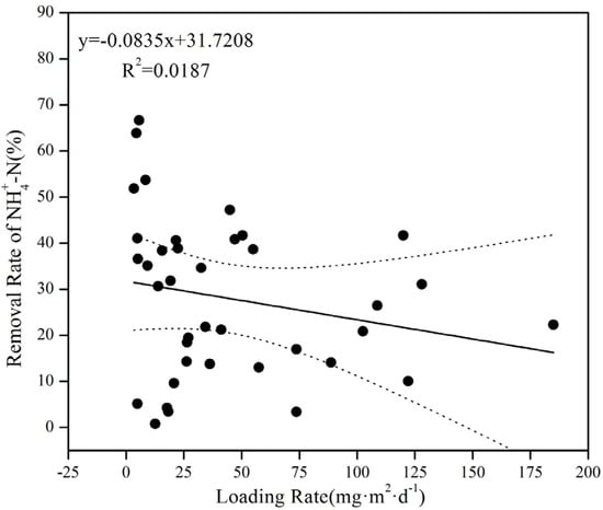 There is a generally a good relationship between the inflow and outflow concentrations and loadings of TN and NH4+-N in this research. Also, N removal efficiency in constructed wetlands generally falls within a certain range, regardless of whether the N load is large or small []. In this study, we found that the NO3−-N pollution load and removal rate were strongly correlated (R2 = 0.96, p < 0.01) (Figure 3), but that the NH4+-N pollution load and removal rate were not correlated (R2 = 0.02, p > 0.01) (Figure 4).