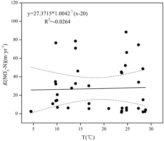 Relationship between the temperature and areal rate constants for NO3−-N (the dotted line is the 99% confidence limit).
