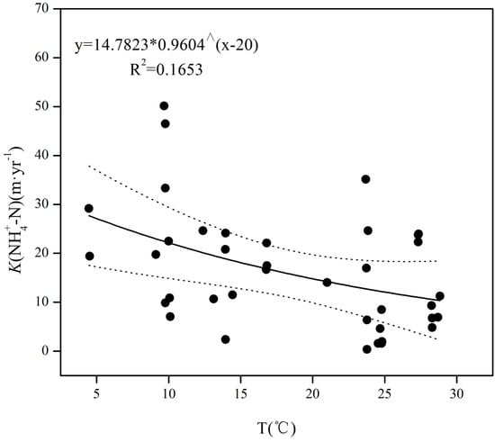 Relationship between the temperature and areal rate constants for NH4+-N (the dotted line is the 99% confidence belt).