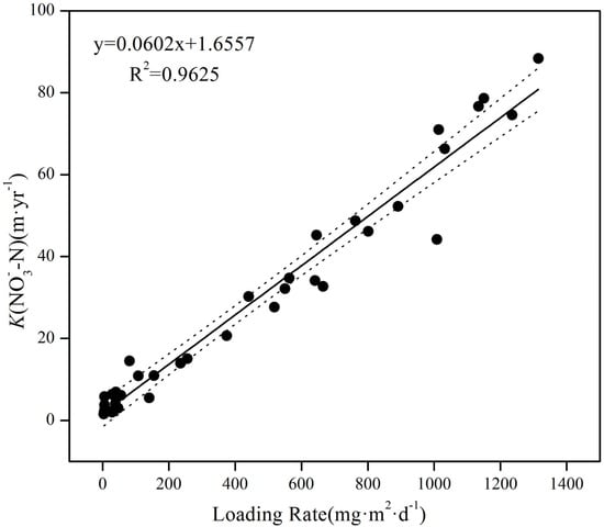 Relationship between the areal loading and areal rate constants for NO3−-N (the dotted line is the 99% confidence limit).
