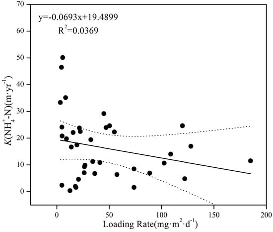 There was a strong linear correlation (R2 = 0.96, p < 0.01) between the area-based constants and loads of NO3−-N (Figure 7). The area-based constants and loads of NH4+-N were not correlated (R2 = 0.037, p > 0.01) (Figure 8), possibly because the NH4+-N loads over the entire study period were lower. This also indicates that the area-based constant can accurately reflect the removal potential of different pollutants in wetland systems that are in receipt of high pollutant loads [].