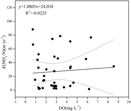 Relationship between DO and areal rate constants for NO3−-N (the dotted line is the 99% confidence limit).