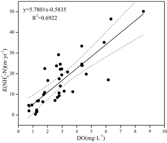 As shown in Figure 9 and Figure 10, the inflow DO concentrations had a minimal influence on the NO3−-N area-based constants, and the inflow DO concentration and NH4+-N area-based constants were positively correlated (R2 = 0.69, p < 0.01). The lower NH4+-N removal rate may be the result of the lower DO concentrations; these lower DO concentrations lead to anaerobic conditions in wetlands, increase denitrification, and decrease nitrification. In addition, the low DO concentrations may be related to the lack of temperature effects. The lower DO levels would cause a decrease in biodegradation, which suggests that a significant portion of the N removal is driven by physical processes that are not influenced by temperature.