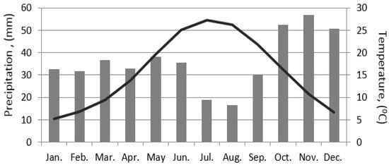 The climate is continental at the western and central side of Thessaly and Mediterranean at the eastern side. Winters are cold and wet and summers are hot and dry with a large temperature difference between the two seasons. Mean annual precipitation over the Thessaly region is about 700 mm and it is distributed unevenly in space and time. The mean annual precipitation varies from about 400 mm in the central plain area to more than 1850 mm at the western mountain peaks. Generally, rainfall is rare from June to August. The mountain areas receive significant amounts of snow during the winter months. The mean annual temperature and mean monthly rainfall of the broader area for the period 2013–2015 are presented in Figure 2.