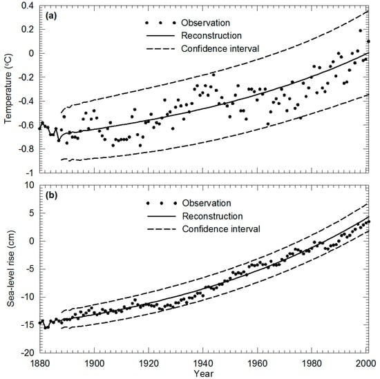 In order to validate the performance of the model, a 10-fold cross-validation technique is applied to the measured dataset of SST and SLR from 1880 to 2001 []. In this cross-validation technique, the dataset is randomly divided into 10 equal subgroups. Of the 10 subgroups, a single subgroup is retained as the validation data for testing the model while the remaining nine subgroups are used to identify the model. This process is repeated 10 times and the resultant parameters of the model are averaged to produce a single estimation. The resulting matrices are given in Table 2. When compared with Table 1, the values of the corresponding coefficients are very close to those presented in Table 1. When we used these matrices to reconstruct the SST and sea levels from 1880 to 2001 relative to 1990 levels, the resulting RMSEs were 0.1118 and 0.7828, and the R2 was 0.7148 and 0.9773 for SST and SLR, respectively. These values are almost identical to the results obtained from the model identified using the complete dataset from 1880 to 2001.