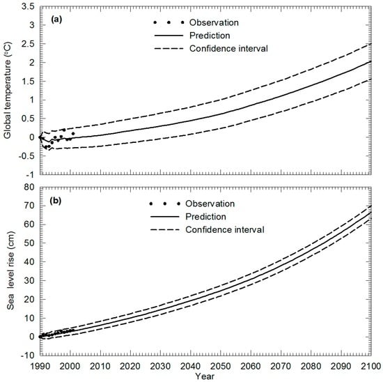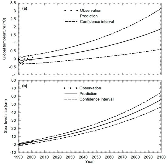In order to incorporate the modeling and measurement errors, confidence interval theory can be used for reliability analysis []. For a given confidence level α, 100 (1 − α) confidence intervals for global SST and SLR for dynamic prediction can be estimated by,
