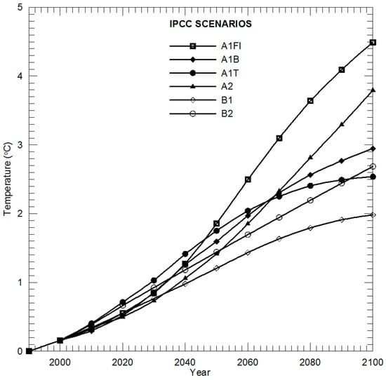 The SLR in the 21st century depends on natural and anthropogenic radiative forcing generated by greenhouse gases such as carbon dioxide (CO2) []. In order to assess the impact of greenhouse gas emissions on global warming, IPCC have developed six emissions scenarios based on different patterns of economic development, industrial development, and population growth in the future and modeled physical processes [,]. These emission scenarios are labeled A1FI, A1B, A1T, A2, B1 and B2 []. Among these scenarios, A1FI and A2 represent the highest emission of greenhouse gases into the atmosphere, A1T and B1 represent the least emissions, and A1B and B2 represent moderate emissions. The IPCC projected the global mean surface temperature dynamic processes from 1990 to 2100 for the six scenarios using the climate models (IPCC, 2007), which are shown in Figure 4. Accordingly, the temperature increase at the end of the 21st century spans from 2 to 4.5 °C depending on which scenario occurs.