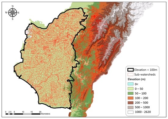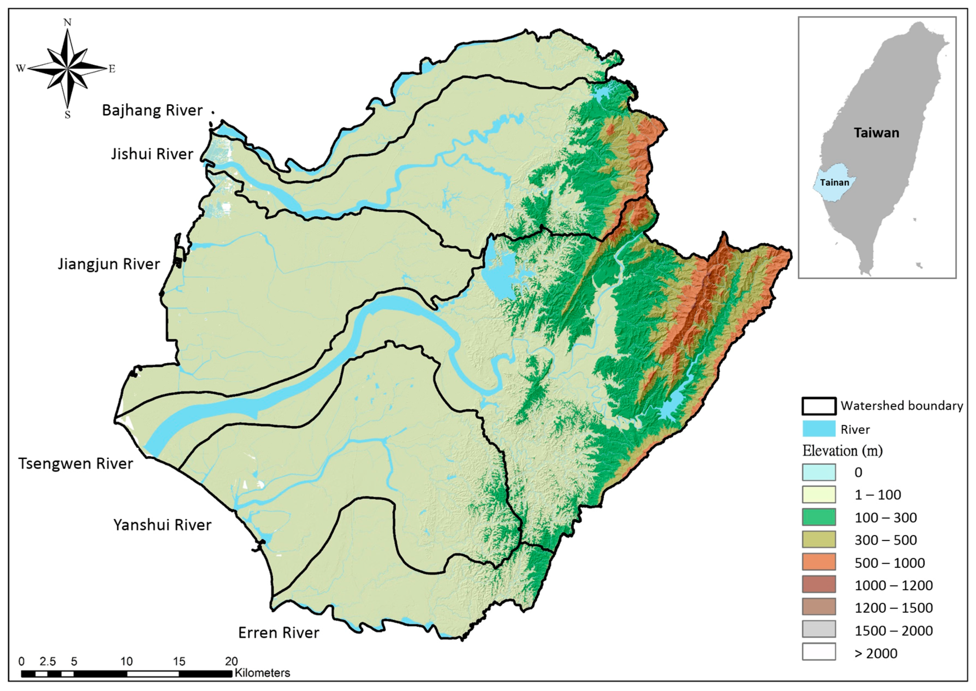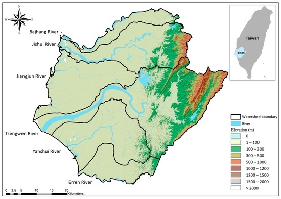 Gridded arrays of elevations with 40 × 40 m spatial resolutions in hillside fields and mountainous areas (elevation > 100 m) and with 5 × 5 m resolutions in low-lying areas (elevation < 100 m) were collected. The DEM used in this study is generated by Light Detection and Ranging (LiDAR) with 10–15 cm accuracy in height, provided by Ministry of Interior of Taiwan. The DEM-based topography of Tainan City is also shown in