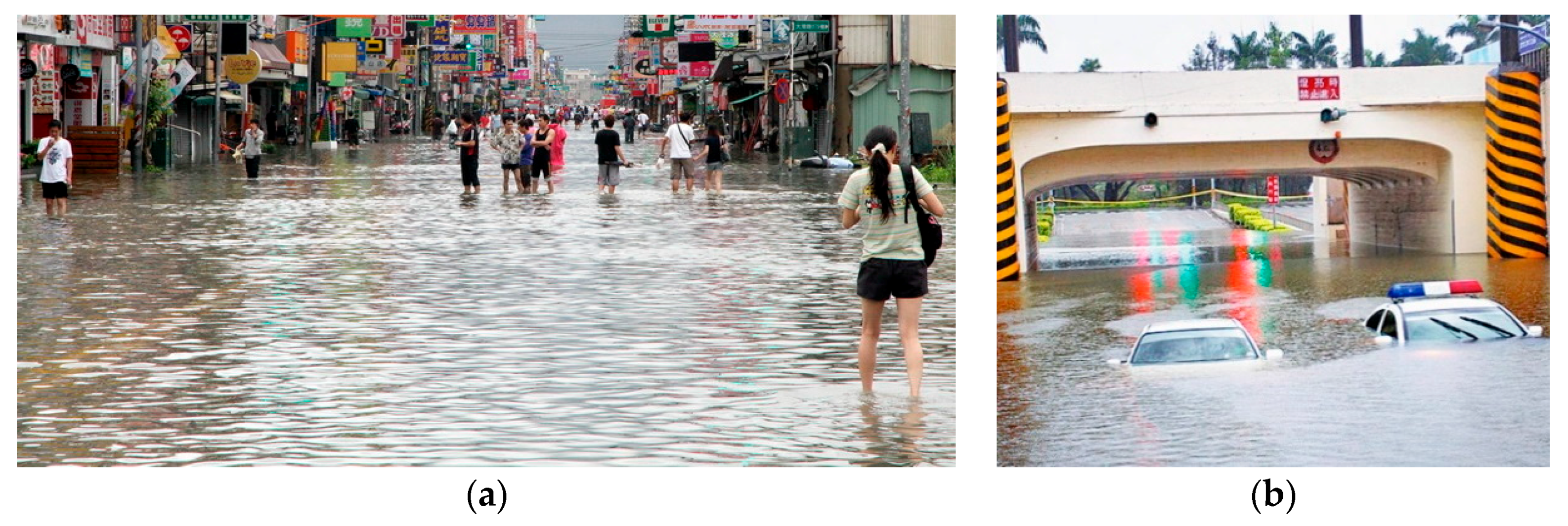 Figure 2. The floods that occurred in Tainan City were generally induced by multiple factors, including rainfall which exceeds the drainage system capacity, a poor condition of the drainage system, flood defense failure, rising sea level due to high tides and/or storm surges, and urbanization. According to historical records, several typhoons, such as Morakot in 2009 and Kongrey in 2013, have hit Taiwan. These typhoons were accompanied by abundant rainfall that caused serious damage, especially in Tainan. More than 300 projects have been implemented in Tainan City to prevent flooding over the past 10 years, but these projects have not solved the problem. Tainan City is selected as the study area not only because of its significant urban development but also because rainfall is the dominant factor that influences flooding.