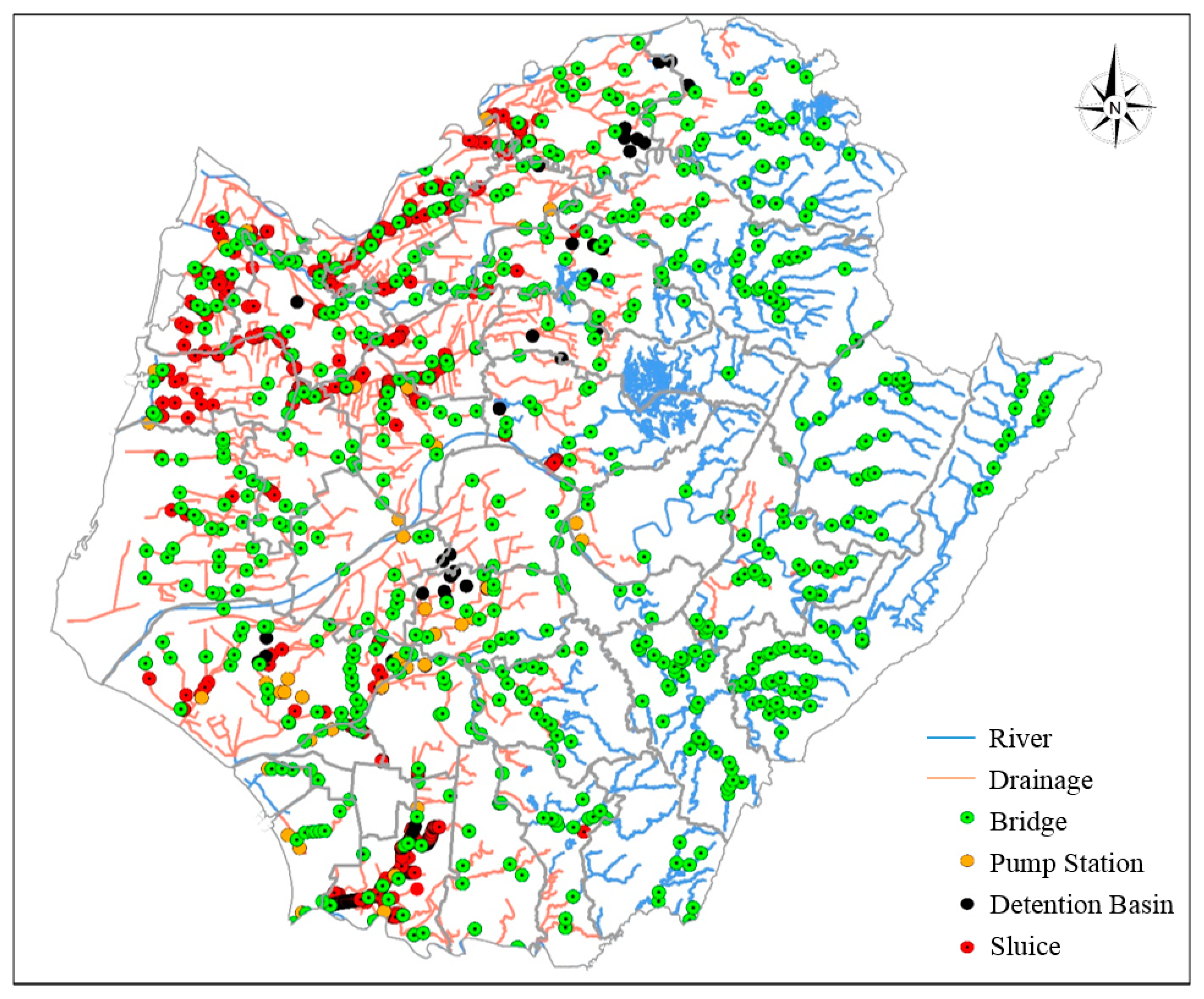 Figure 4. The drain is a type of sewer system. The regional drainage system generally consists of a secondary drainage system with a network of small drains attached. The small drains transport rainwater to a primary drainage system composed of main drains that serve large areas. The main drains are connected to rivers. There are 662 rainwater drains, as shown in