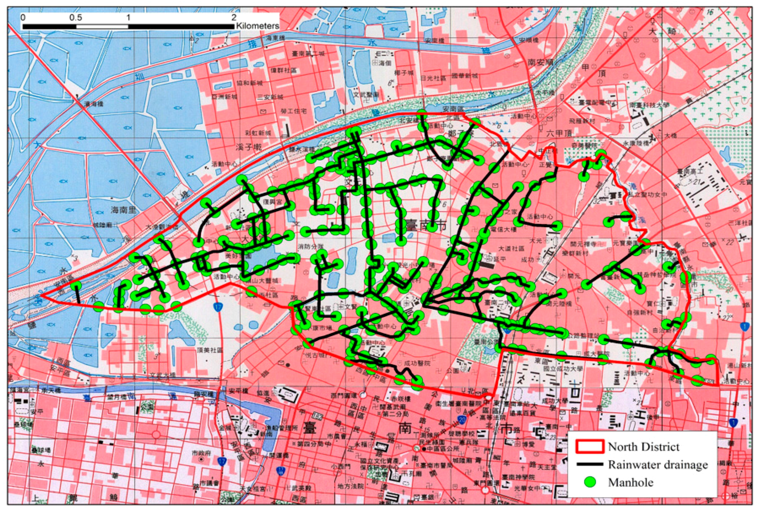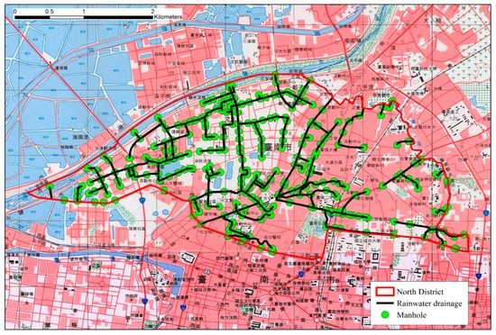 56]. The locations, lengths, shapes and elevations of sewers were collected. There are 4335 underground sewer pipes and 8345 manholes in Tainan City.