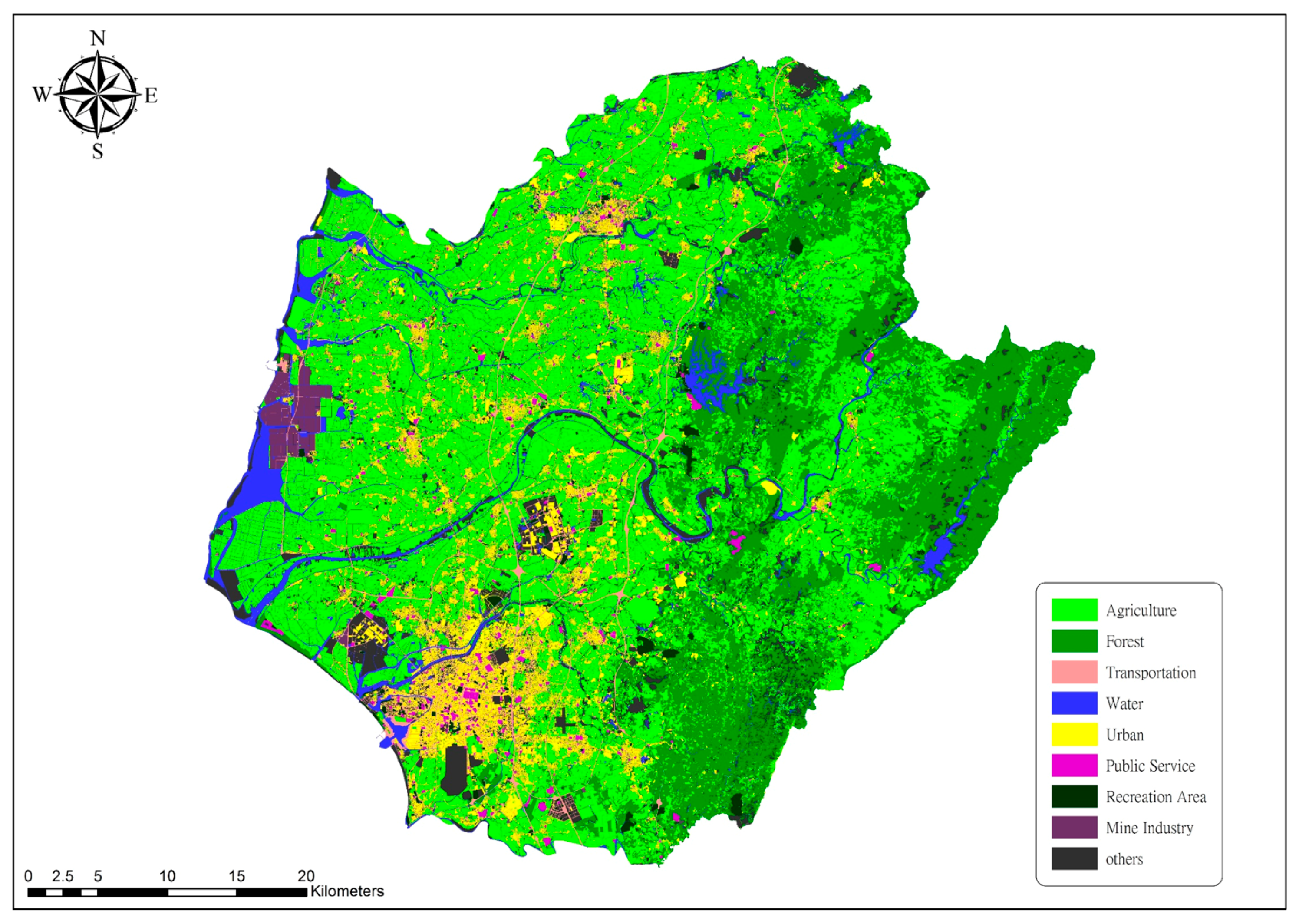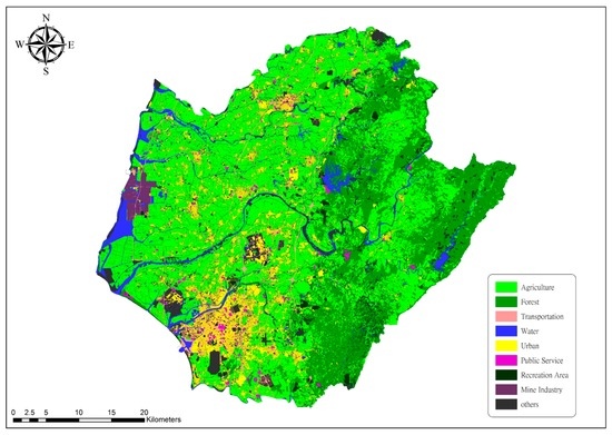 Figure 6 were collected to identify the land roughness and derive the flow behavior. In Tainan City, more than 45% of the land is used for agriculture. Only 35% of Tainan City comprises villages or urban areas.