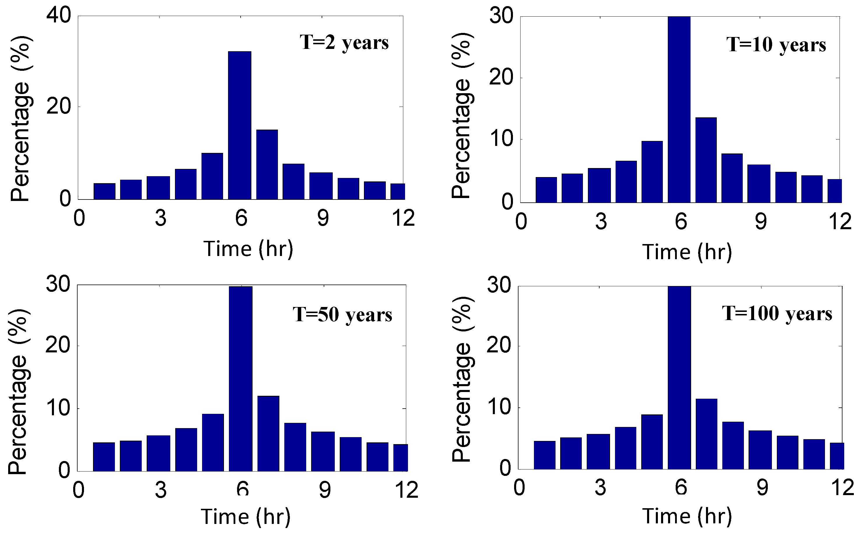 Figure 7 shows the designed storm hyetograph at Tainan Station for 2-, 10-, 50- and 100-year return periods and a 12-h duration.