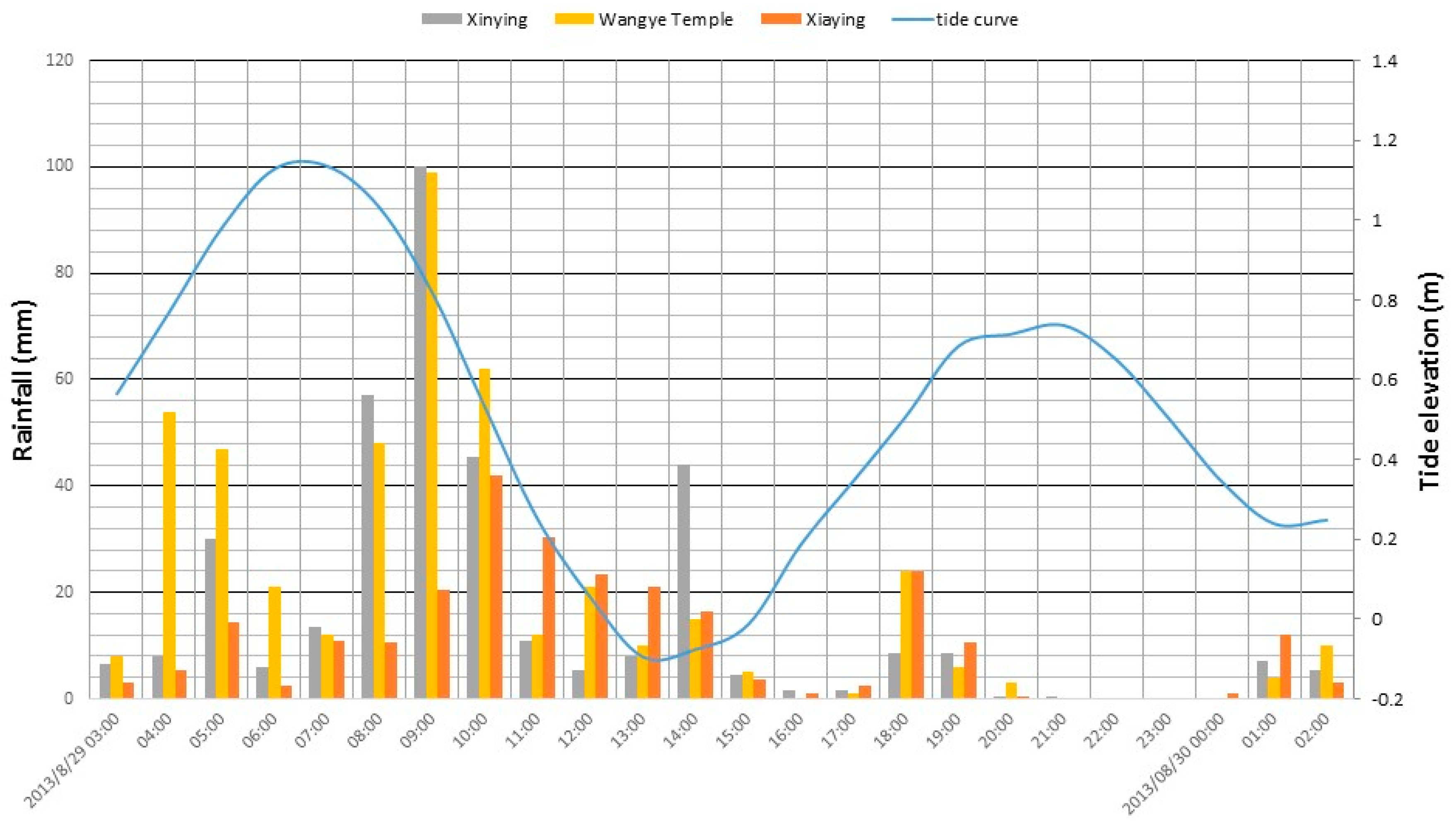 Figure 9 with corresponding tidal elevation. The maximum three-day rainfall depth is 636 mm, and the maximum hourly rainfall intensity is 100 mm/h. The simulated flood extent and depth during Typhoon Kongrey are shown in