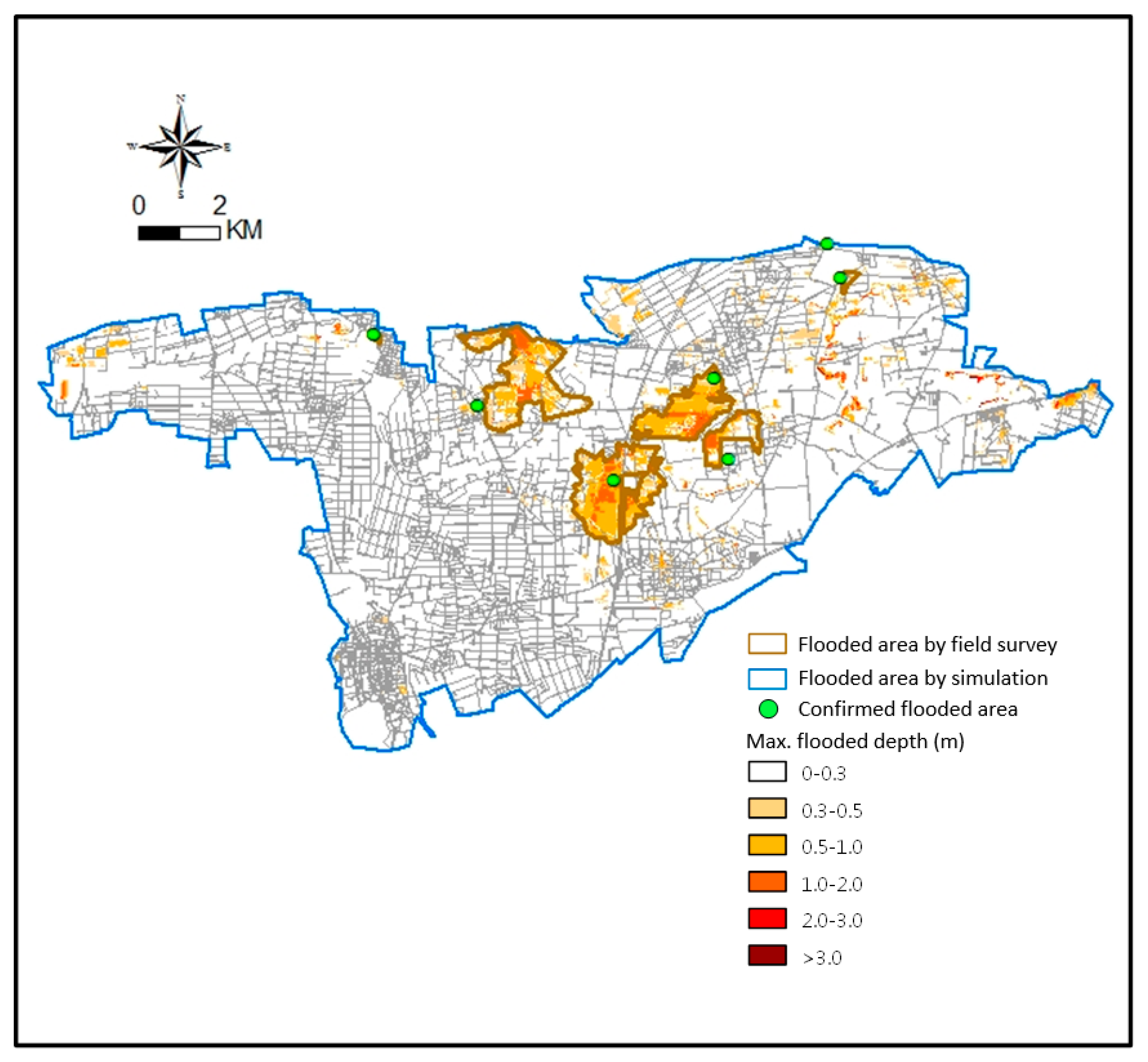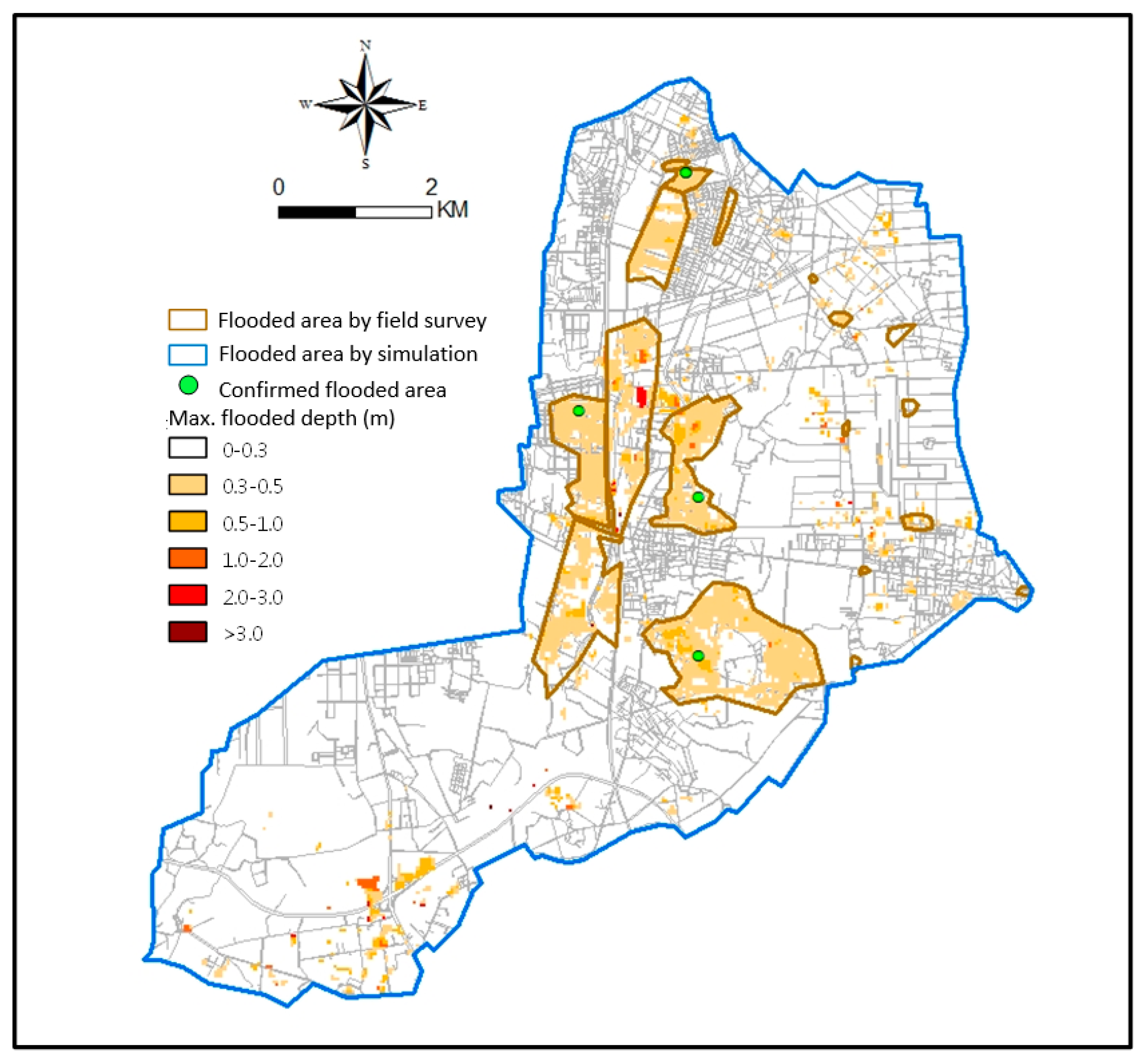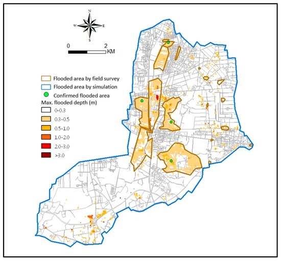 Figure 11 shows another validation event in the Sanyeh drainage system. The flood conditions determined by field investigations are shown in the figures. The maximum flood depths are 2.41 m and 4.4 m in the events, respectively.