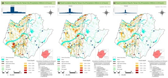 Figure 12 shows the FIMs for a cumulative rainfall of 400 mm and durations of 6, 12, and 24 h. The maximum flood depth for a rainfall of 400 mm in 6 h (scenario code CR-6-400) is higher than 3 m in Annan District (between the Tsengwen and Yensui Rivers). The total flooded area of scenario CR-6-400 is 1.73 times that of CR-24-400. However, the flood induced by scenario CR-6-400 is only 1.26 times that of CR-6-100. Therefore, the rainfall intensity is a more influential factor than the total rainfall amount.