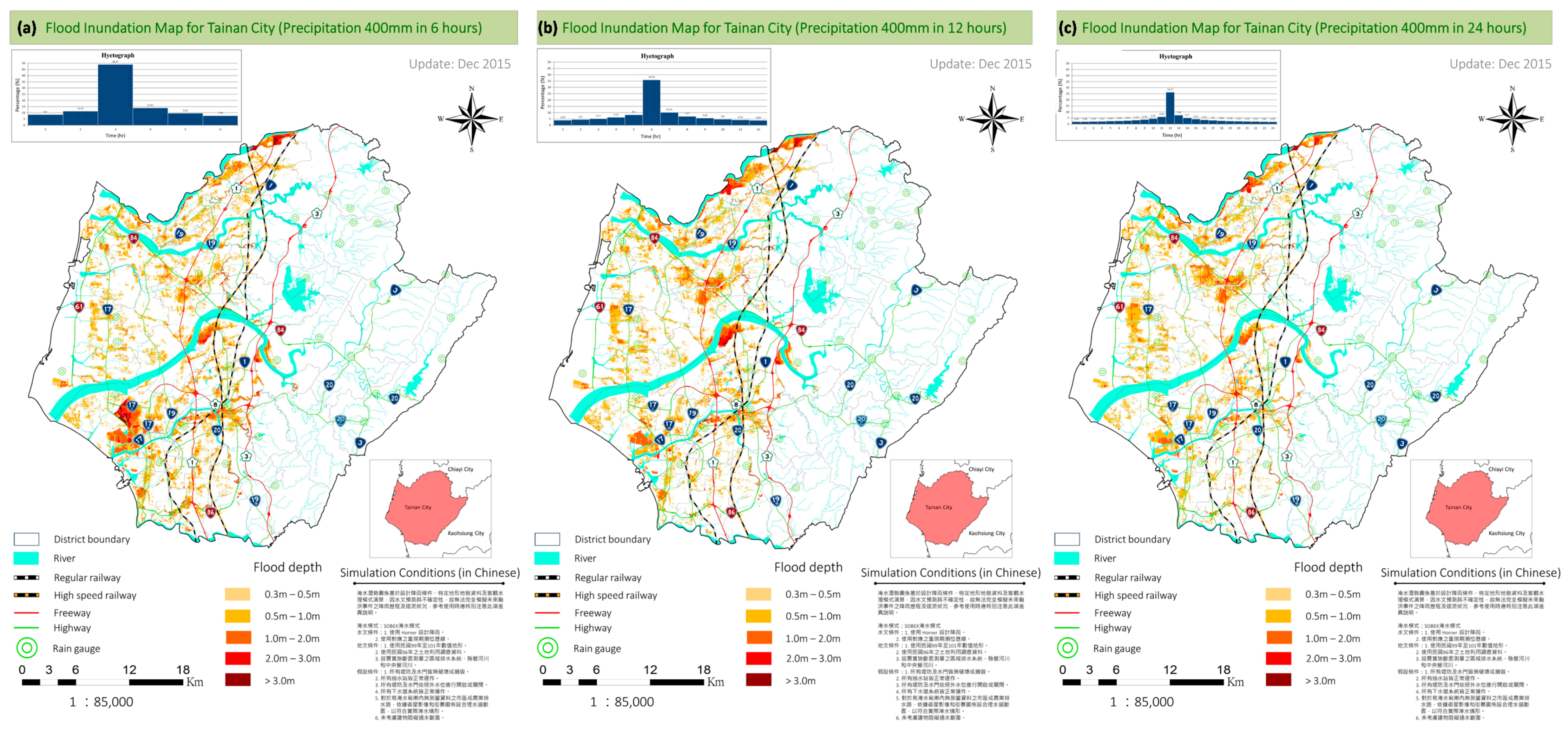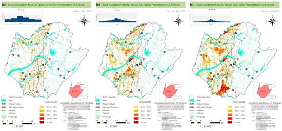 In total, forty-two scenarios were used in the development of FIMs in the Tainan City. In the present work it was found that the rainfall intensity affects flood conditions more than the accumulative rainfall depth. The tidal phase is another important factor associated with the flooding scale, in the low-lying areas in Tainan City. Areas with elevation less than 1 m are frequently flooded during the high tide phase no matter how high is the scale of the rainfall intensity and depth. Storm surges are the third key factor that influences flooding in the coastal area of Tainan City. The study revealed that the extreme scenario (100-year rainfall for 24 h) would cause severe flooding in the western Tainan. It was found that one-third of the entire Tainan City would be flooded under this extreme scenario.