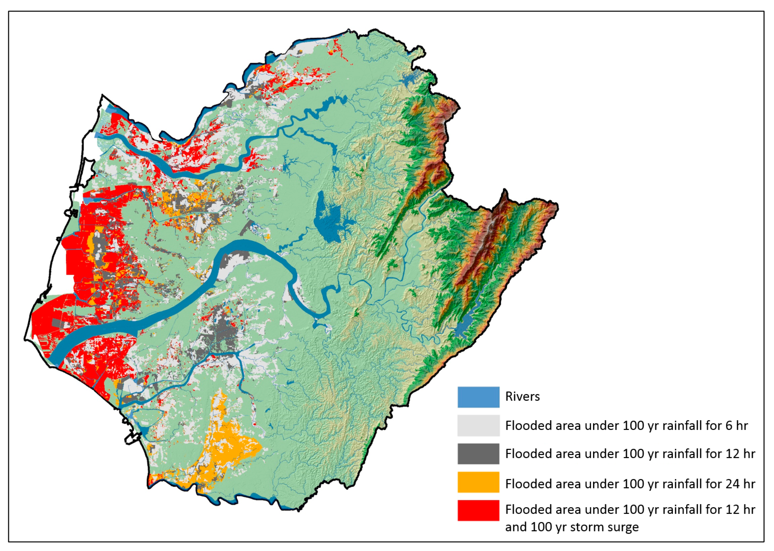 Figure 13 shows the FIMs with 100-year rainfall and durations of 6, 12, and 24 h. These rainfall scenarios with different return periods are similar to those of cumulative rainfall, but they are presented differently to satisfy different requirements. Flooding began to occur in the coastal area (elevation < 1 m) for low-intensity rainfall events such as PR-12-2 or PR-24-5. The flooding is due to low-lying land in the coastal area. When the rainfall intensity increases, such as in scenarios PR-6-2 and PR-12-10, the flood extent expands due to the influence of low-lying areas. However, when the rainfall intensity increases, such as in scenarios PR-6-10, PR-12-50, and PR-24-100, the flood extent reaches elevation > 10 m in some areas because the river discharge capability decreases due to tidal chokage.