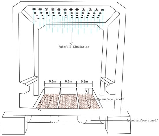The main experimental setup used in the study consists of a rainfall simulator and runoff trays (Figure 1). The simulator (model Dik-6000, Daiki Rika Kogyo Co., Ltd., Shiga, Saitama, Japan) is fitted with 324 nozzles (rain needles), which comprised of aluminum channels assembled in the steel frame. A vibration motor is attached to the frame, generating the desired raindrop size (1.7–2.8 mm) by adjusting the number of revolutions of the motor, which produces rainfall intensity that can be precisely adjusted by two flow meters. The experimental runoff trays mainly consist of iron trays and plastic containers. The size of the iron trays is 1 m × 0.3 m × 0.4 m (length × width × height) that can be adjusted to the desired slope angle using a jack. The plastic container of 10 L in volume was used to collect the runoff and sediments. It was set at the outlet of the runoff tray at the beginning of each rainfall simulation and changed several times in each interval. Finally, the total runoff volume of each interval was recorded.