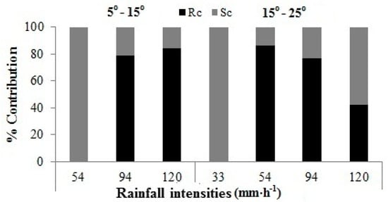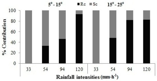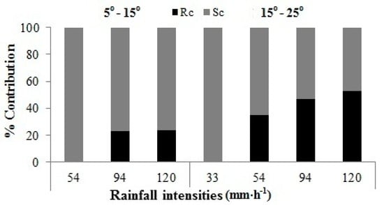 The results, in Figure 2, indicate the contribution of rainfall (Rc) and slope (Sc) on runoff losses during different rainfall intensities with different slope steepness. The Sc was 100% during the rainfall intensity of 33 mm·h−1 with an increase in slope steepness from 5° to 15° and 15° to 25°. The higher Sc of >50% was found for rainfall intensities of 33 mm·h−1 and 54 mm·h−1 with an increase in slope steepness from 5° to 15° and 15° to 25°. However, Sc was higher (>50%) and lower (<50%) during rainfall intensity of 94 mm·h−1 with an increase in slope steepness from 5° to 15° and 15° to 25°, respectively. Moreover, the lower Sc (<50%) was found for rainfall intensity of 120 mm·h−1 with an increase in slope steepness from 5° to 15° and 15° to 25°. Thus, results show that with an increase of rainfall intensity and slope steepness, the Sc and Rc were decreased and increased, respectively. When the Sc becomes negligible, then it indicates the critical level where runoff losses are only depending on rainfall intensity. A previous study reported that; ‘there exists a critical slope above or below of it, the runoff exhibits different behavior’ [], and when slope angle is less than a critical threshold, runoff rate increases greatly with slope, while when the slope is steeper than the critical threshold, the runoff rate is less influenced by slope [,]. However, the results herein show that the critical slope level could vary with rainfall intensities (Figure 2), and be achieved earlier for intense rainfalls as compared with gentler rainfall intensities.