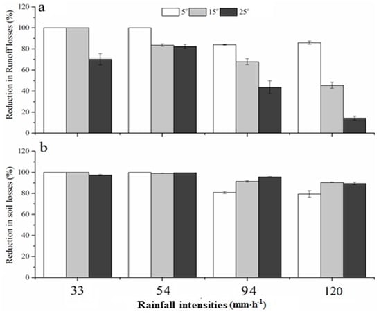 Mulch significantly (α = 0.05) reduced (81% to 100%) the sediment losses relative to the un-mulched control (Figure 4b), because unprotected purple soil is more vulnerable to erosion compared to other soil types. Nonetheless, the sediment loss during rain events could decrease up to 90% with the vegetation cover of up to 80% []. Mulching strongly reduced sediment loss at higher rainfall intensities and slopes relative to reductions in runoff loss (Figure 4b). This trend indicates that straw mulch filtered sediment from the runoff water, and reduced the sediment loss which was negligible even at the 25° slope during rainfall intensity of 120 mm·h−1. Despite the minimal sediment loss, only 14% reduction in runoff generation was observed for the same rainfall intensity and slope (Figure 4a,b). On steeper slopes, gravitational force accelerates the runoff flow but decreases sediment loss, because of the retention of soil particles within the mulch (Figure 4b). Thus, an unequivocal reduction in sediment loss occurred by straw mulch, which mitigated the erosive effect of increasing rainfall intensities, even at the steepest slope. Furthermore, the conservation effectiveness during high rainfall intensities (94 and 120 mm·h−1) increased with slope steepness (Figure 4b). Indeed, sediment losses during intense rainfall increased with slope steepness in un-mulched treatments, but with little effect of slope in mulch treatments (Table 3). Detached particles are transported by the flow velocity of runoff due to the slope effect []. The mulch reduced the overland flow and sediment losses by 52% and 93%, respectively, relative to the un-mulched treatment []. Moreover, the sediment loss could be reduced by up to 89% due to the mulch effect [].