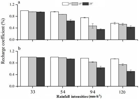 - The infiltration rate decreased with an increase in slope and increased with an increase in rainfall intensity. The effect of rainfall intensity on the infiltration rate changed with the slope angle due to the creation of different micro-relief features. In mulched soil, however, the water infiltration rate significantly increased with an increase in rainfall intensity at all slopes because of the uniform surface conditions under the mulch layers. The recharge coefficient decreased with an increase in rainfall intensity and an increase in slope steepness in all treatments, whereas the mulch maintained a higher infiltration rate and RC compared with un-mulched treatments.