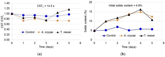 The empirical CST test is well established as the leading method for the determination of sludge dewaterability, despite its shortcomings including restricted possibilities to model and, therefore, predict physical processes, such as the amount of water bound by the filter paper. The CST method is easy to conduct, cost-effective and accurate [22] and was used to assess the sludge dewaterability in this study. The specific resistance to filtration (SRF) test is also commonly used to estimate sludge dewaterability; however, SRF is much more expensive and time-consuming compared to the CST test [23]. Figure 1 presents the results of the CST tests conducted in this study. The initial CST of sludge samples was 14.5 s. In general, the fungal conditioning reduced the CST of the sludge. The CST reduction after three days of conditioning was 25% for both fungi. At the end of the experiments (five days), the CST reduction for A. oryzae was 27%; meanwhile, the CST for T. reesei increased unexpectedly during the last two days. There is no clear explanation for this result, but might be associated with the greater increase of the microbial community during T. reesei conditioning, which limited the growth of the fungi and consequently the enhancement of the sludge dewaterability, as discussed in Section 3.5. According to the literature [22,23,24], a large CST usually implies a poor sludge filterability; therefore, it can be said that fungal conditioning eased the filtration of the sludge, i.e., enhanced the activated sludge dewaterability. However, to confirm this result, the effect of fungal conditioning onto the solids concentration of sludge has to be considered.
