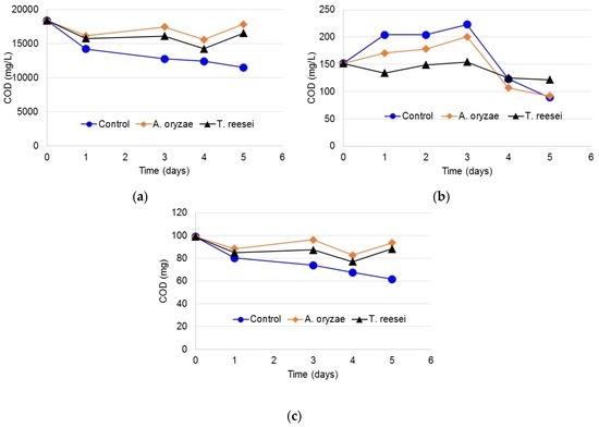 Evolution of COD during the fungal conditioning of activated sludge. (a) Particulate COD (biosolids); (b) soluble COD (supernatant); (c) total COD (particulate + soluble).