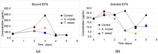 The results of protein analysis in bound and soluble EPS are shown in Figure 3. As seen, the concentration of proteins in bound and soluble EPS increased during the fungal conditioning in comparison with the control. The maximum concentration of proteins was observed after three days of conditioning, which was especially visible in bound EPS for T. reesei. The increase of protein contents means that proteins were released from the EPS matrix. The protein chains were broken down by extracellular hydrolytic enzymes secreted by the fungi, as reported by [25]. Secretion of the enzyme protease by the two types of fungi used in this study has been reported in the literature [26,27]. Regarding the results of the control, a slight increase in protein concentration was only observed in the first two days of the experiments; this means that protein chains of the EPS were hydrolyzed to a limit. Thus, these results confirm that fungal conditioning contributed to enhancing the hydrolysis of EPS which consequently enhanced the sludge dewaterability, as discussed in Section 2.3.