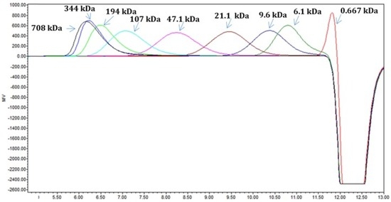 Identification of molecular mass and elution times of polysaccharide standards.