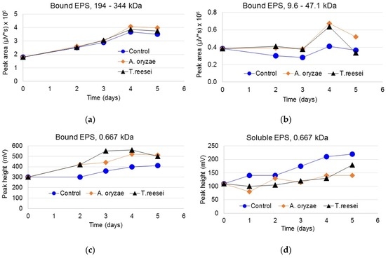 The qualitative determination of polysaccharides consisted of the identification of polysaccharides based on their molecular mass. Figure 4 shows the molecular mass and the elution time for each carbohydrate standard. For better separation performance, only three molecular mass ranges were selected for analysis, 194–344, 9.6–47.1 and 0.667 kDa, with elution times of 6.0, 9.7 and 11.7 min, respectively. Peak areas were used to estimate the two molecular mass ranges of 194–344 and 9.6–47.1 kDa, and the peak height for the molecular mass 0.667 kDa due to distortion created by the mobile phase at elution time 11.7. In Figure 5, the results of the polysaccharide identification are shown. As seen in the case of bound EPS, polysaccharides of the three molecular mass ranges were detected and their response was greater during fungal conditioning in comparison with that of the control. The maximum polysaccharide response was observed after four days of conditioning for the larger molecular sizes and after three days for the molecular mass of 0.667 kDa. The increase of the polysaccharide response means that carbohydrates were released from the EPS matrix due to the hydrolysis conducted by the extracellular hydrolytic enzymes secreted by the fungi. This result is in agreement with that obtained for proteins. On the other hand, in the soluble EPS extracts only the 0.667 kDa polysaccharide was detected. Its content increased with time; however, unlike the bound EPS extracts, the content was greater on the control samples. The 0.667 kDa molecular mass corresponds to stachyose, a tetrasaccharide that is hydrolyzed by α-galactosidase, an enzyme secreted by both fungi. Thus, when the stachyose was released from the bound EPS matrix and solubilized, it was hydrolyzed by the α-galactosidase, decreasing its content in the soluble EPS of the fungal-conditioned samples. Upon hydrolysis, stachyose gives four molecules of the same or different monosaccharides, among them glucose.