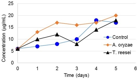 Two reactors filled with 4 L activated sludge were prepared. One of them was inoculated with 40 mL fungal spores’ suspension (see Section 2.2) and the other was used as the control. Both reactors were incubated for five days under the conditions described in the Section 2.3. The concentrations of spores of T. reesei and A. oryzae were 3.08 × 106 and 3.14 × 106 spores/mL, respectively.