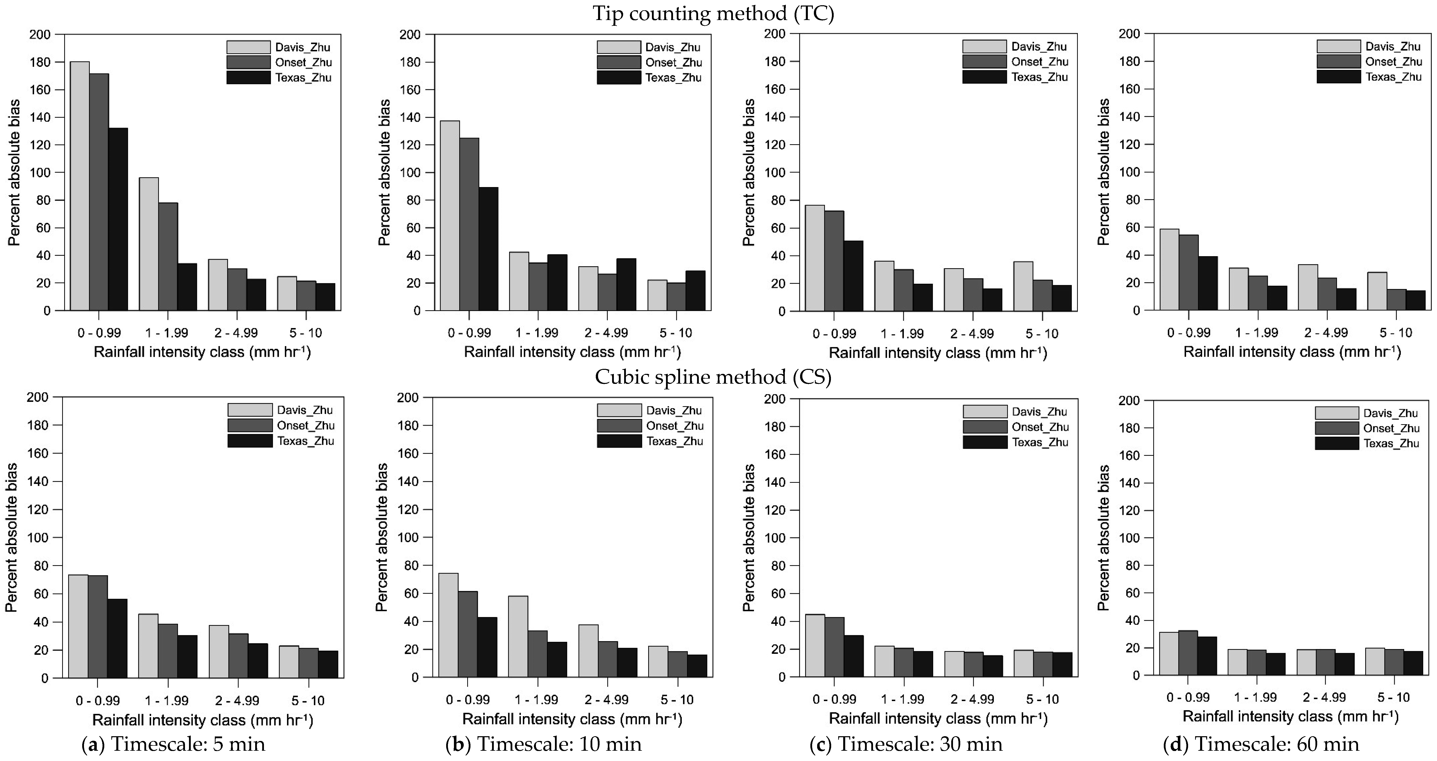 The minimum Spearman correlation coefficients (ρ) between the calculated intensities and their references were respectively 0.85 and 0.87 for the TC and CS method. In fact, regardless of the method of calculation, the correlation is inversely related to the timescale of data, with higher correlations for the 30 and 60 min (up to 0.95) timescale. Hence, the error tends to increase when the timescale decreases. A reduction in error was observed when the timescale increases for both the TC and the CS methods, as shown in Figure 2. Furthermore, the data in this figure clearly illustrate that the percent absolute bias for the Davis_Zhu and Onset_Zhu rain gauges varies from 75% to 30% for rainfall intensities lower than 2 mm·h−1 and timescales of 5 and 10 min. For the Texas_Zhu rain gauge, percent absolute bias varies from 55% to 25%. Those results clearly show the difficulty in adequately measuring intensities with TB rain gauges in the páramo region, given the overall low rainfall intensities.
