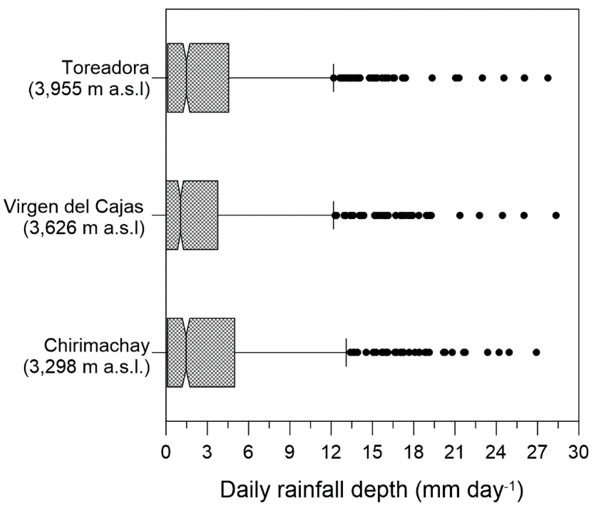 Figure 3 presents the notched box-whisker plot of daily rainfall (mm·day−1) constructed for 5-min rainfall measurements along an altitudinal gradient in the study area. The distribution of the daily rainfall in Toreadora (3955 m a.s.l.) corresponds very well with the distribution monitored in the Chirimachay site (3298 m a.s.l.) with 50% of daily rainfall less than or equal to 1.48 and 1.46 mm, 75% of the daily rainfall less than or equal to 4.55 and 4.99 mm, and 90% of the daily calculated rainfall depths less than or equal to 12 and 12.4 mm. The maximum recorded daily rainfall in both stations is respectively 27.76 and 26.92 mm. Daily rainfalls in the Virgen del Cajas site (3.626 m a.s.l.) are a bit lower with 50% of the events less than or equal to 1.05 mm, 75% of the daily rainfalls less than or equal to 3.76 mm·day−1, 90% less than or equal to 12.1 mm·day−1, and the maximum recorded daily rainfall depth was equal to 28.3 mm. The highest amount of rainfall that the lowest situated observation station (Chirimachay) received over the two-year study period was 2540 mm, which a bit higher than the total rainfall amount recorded in the highest situated station (Toreadora), 2407 mm. In the Virgen del Cajas station, situated at an elevation of 3620 m a.s.l. in between the two other stations, a total rainfall amount of 2140 mm was recorded. The total collected rainfall depth and distribution of daily rainfall depths in the three sites are not very different, supporting the hypothesis that there is no evidence of a significant difference in rainfall pattern along the altitudinal gradient.