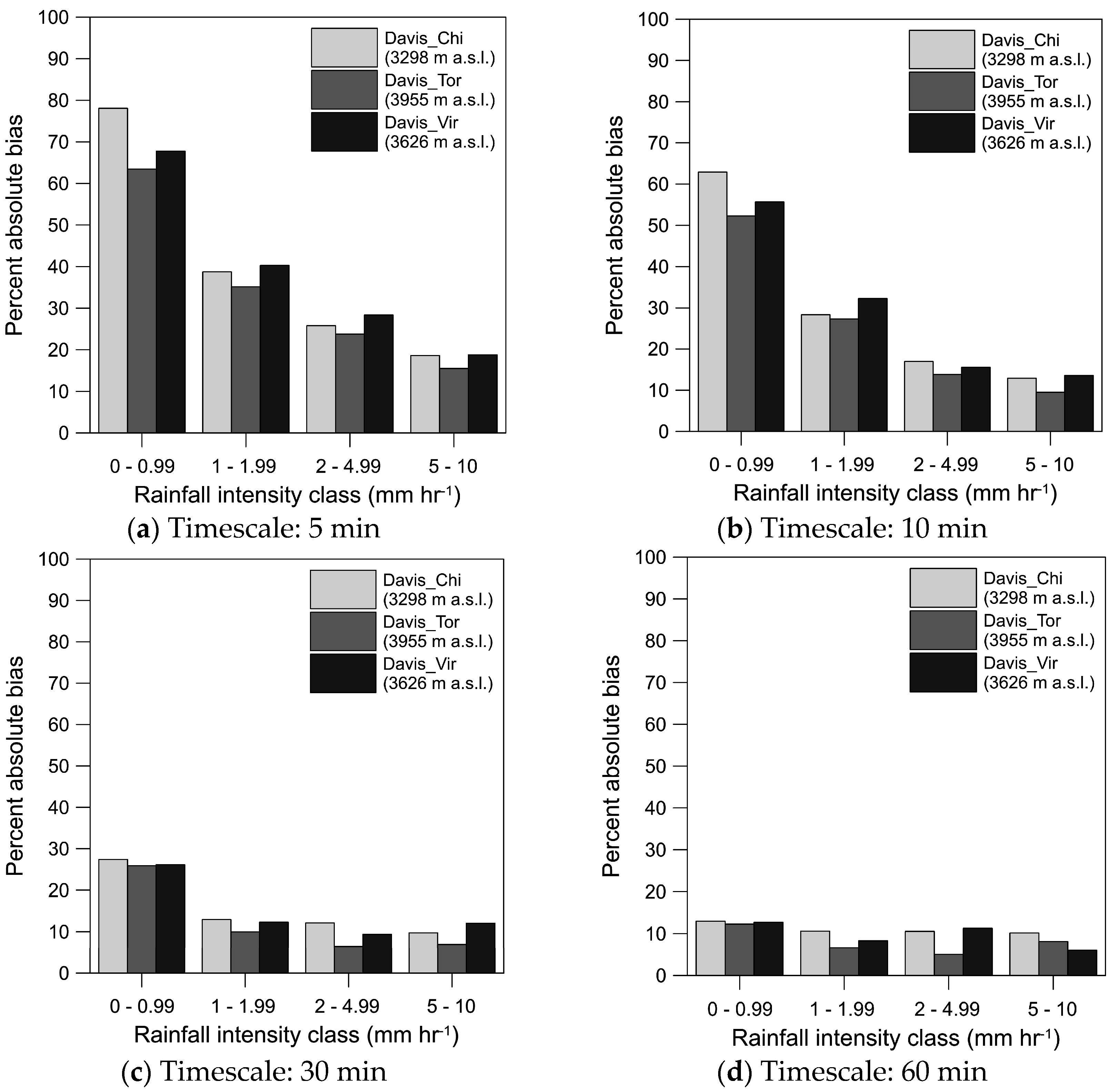Percent absolute bias calculated with the CS method of the Davis with respect to the Texas TB rain gauge for different rainfall intensity classes and timescales, along an altitudinal gradient.