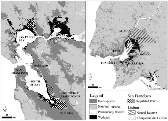 For San Francisco Bay, we analyzed historical maps [10,11,12,13,14,15], as well as landscape reconstructions [14,15], which provide valuable information on the status of the estuary before and at the onset of European settlement. We also drew upon reconstructions of past geography and bathymetry [6,16,17,18,19,20,21,22], which provided information on the patterns of post-glacial flooding of the estuary, and the emergence and expansion of wetlands. For the Tagus estuary, we analyzed prior studies of historical change and paleostratigraphy, especially the exceptional work of Vis [23] and others [24,25,26,27,28,29], and complemented them with the abundant information provided by historical maps [9,30,31,32,33,34,35,36,37,38,39] and historical documentation of land-use [40,41,42,43]. We also consulted historical data [41,42,43] and studies of historical and modern distribution of wetlands [44,45,46,47]. Additionally, we combined map data [18,48,49,50] with the information on wetland distribution from the previous sources in mapping the current situation.