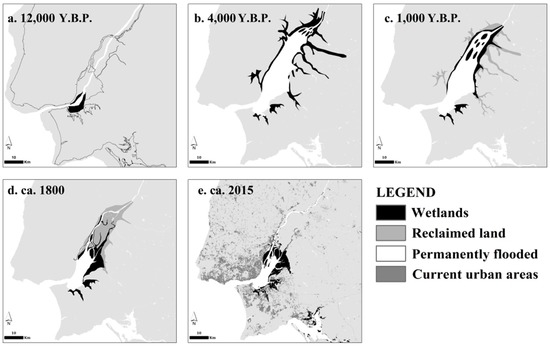 We assembled each reconstruction as a project in GIS software and retrieved the area of each of the following categories: “permanently flooded” (open waters of the estuary); “wetlands” (mudflats, shellfish beds, and saltmarsh); “drained for farmland” (the conjectural extent of former wetlands and permanently flooded areas converted into farmland); “diked ponds” (former wetlands and open waters that were diked for the creation of salt ponds); and “landfilled for urban development” (areas of landfill which were developed as industrial, commercial or residential areas or for large infrastructure—such as ports, airports, highways and rail corridors, refuse disposal). From these values, we created chronograms tracing the relative percentage of each category in relation to the maximum extent of estuarine lands before disturbance (corresponding roughly to the extent of permanently submerged areas and wetlands for the ~4000 Y.B.P. scenario). All values and percentages presented in Section 3.1 are in reference to this historical maximum.