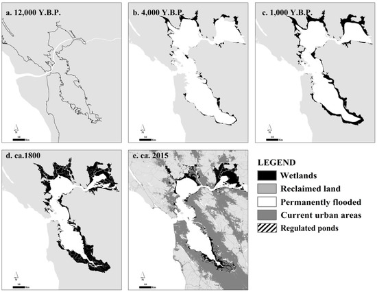 During Pleistocene time, what is now San Francisco Bay was an alluvial plain, across which flowed the lower Sacramento River, joined by its many tributaries. The rapid rise in sea level after glacial melting led to the flooding of SF Bay, reaching approximately its current extent ~5000 Years Before Present (Y.B.P.) [16], and slowing to a rate of about 20 cm/century. The estuary began slowly filling with sediment (from tributaries and the mainstem Sacramento), resulting in the fixation and slow expansion of wetlands from around 4700 Y.B.P. [51,53] (Figure 3b,c) with a slightly accelerated expansion during the Little Ice Age (ca. 1550 to ca. 1850) [54] (Figure 3d) due to land cover changes in the watershed [14,15].