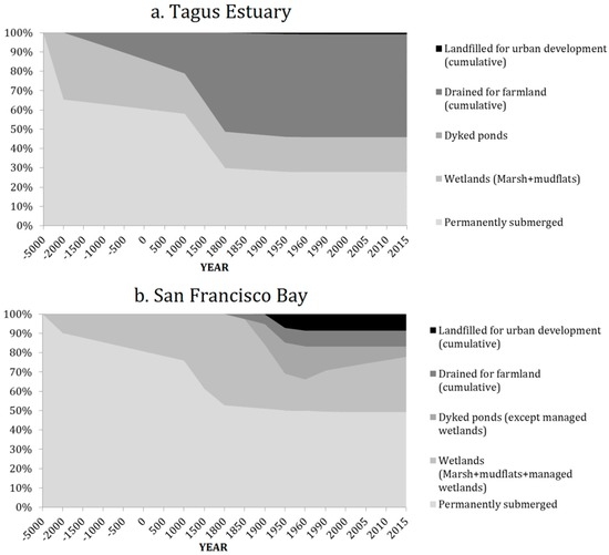 Chronograms tracing the evolution of land cover in estuarine low lands of (a) the Tagus Estuary; and (b) the San Francisco Bay (relative % of total estuarine lowland).